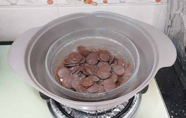 1. 將朱古力粒在熱水坐溶,鹽拌勻